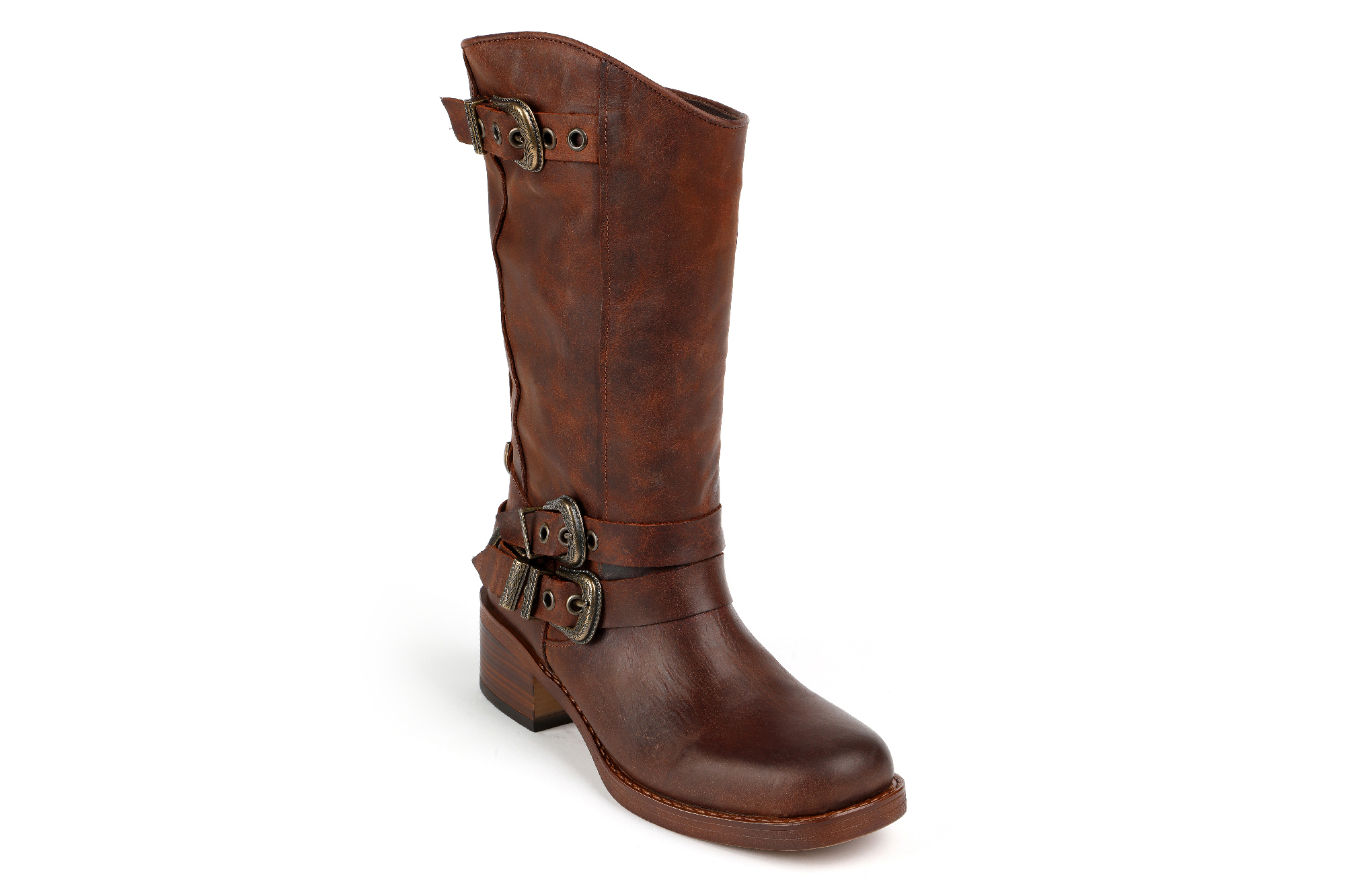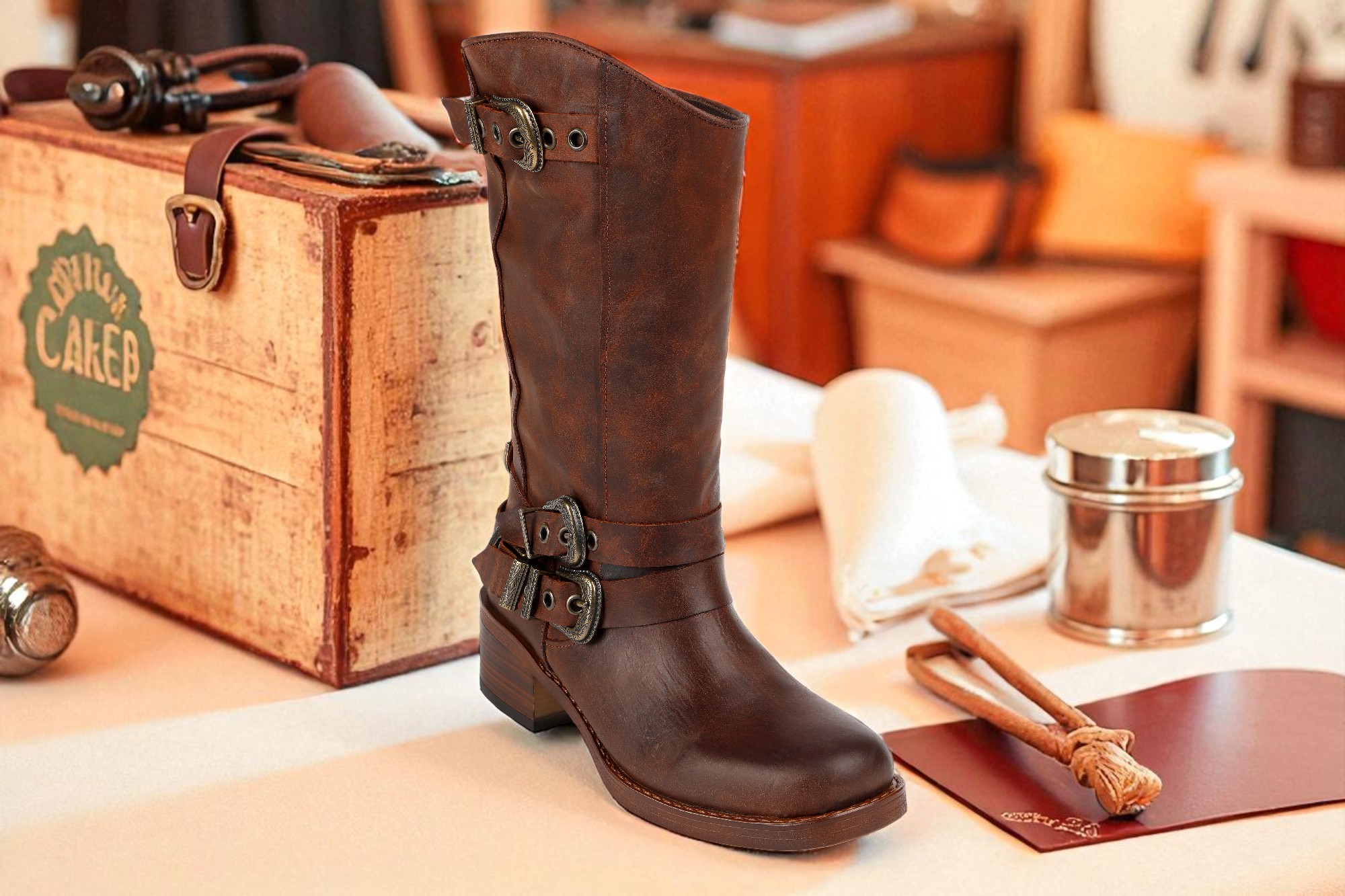 Γυναικεία Δερμάτινη Μπότα με Τακούνι & Vintage Αγκράφες – Καφέ Αντικέ