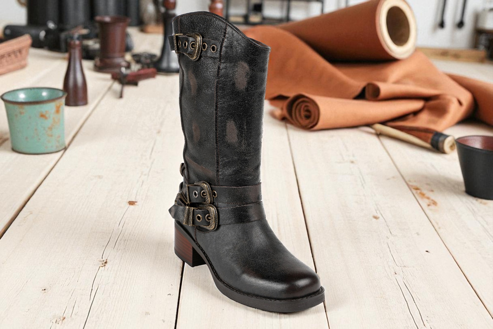 Γυναικεία Δερμάτινη Μπότα με Τακούνι & Vintage Αγκράφες – Μαύρο Αντικέ